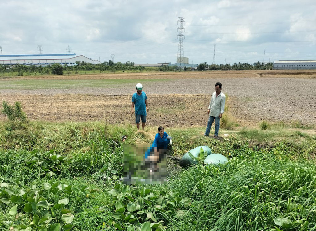 Người đàn ông tử vong dưới kênh đầy bùn sình trong tình trạng chiếc xe máy của nạn nhân và bao chứa cỏ đè lên trên.