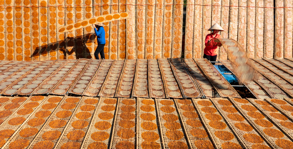 “Năm 2008, tôi có dịp đi Truông Mít. Trong chuyến đi, chạy ngang qua chỗ người ta phơi ớt trên sân, nhìn đẹp quá, tôi quyết định quay lại. Sân phơi ớt đỏ tươi nhưng “canh” mãi không được góc ưng ý. Vậy là tôi mượn chủ nhà cây thang để trèo lên nóc nhà chụp xuống. Tác phẩm đó tôi đặt tên là Ớt khô xuất khẩu, đoạt giải Ba cuộc thi ảnh nghệ thuật của tỉnh. Và đó là tác phẩm đoạt giải đầu tiên của tôi” - NSNA Đỗ Thành Nhân nhớ lại.