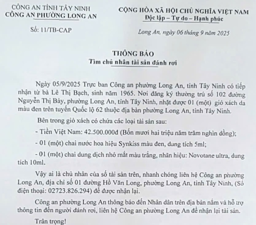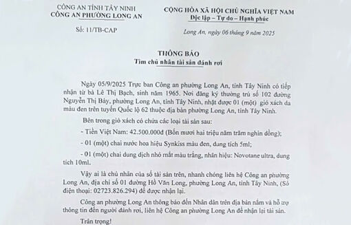 Ngày 08/9, Công an phường Long An (tỉnh Tây Ninh) cho biết, vừa tiếp nhận một giỏ xách do người dân nhặt được và bàn giao, bên trong có nhiều tài sản giá trị.