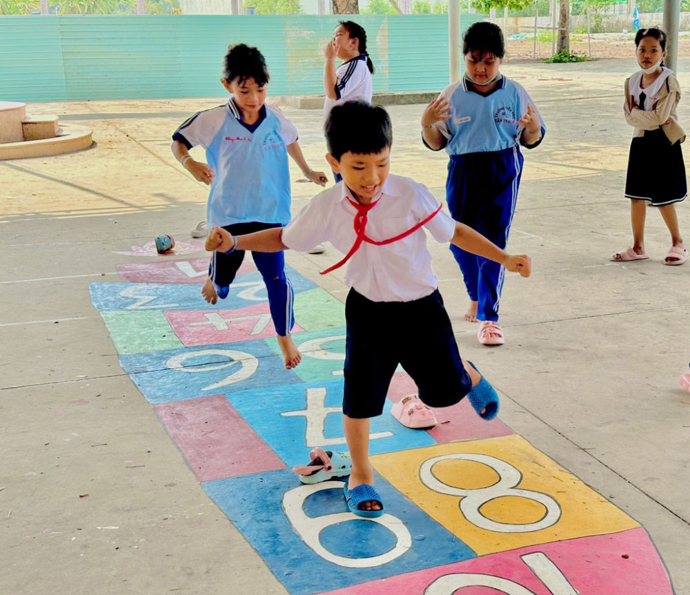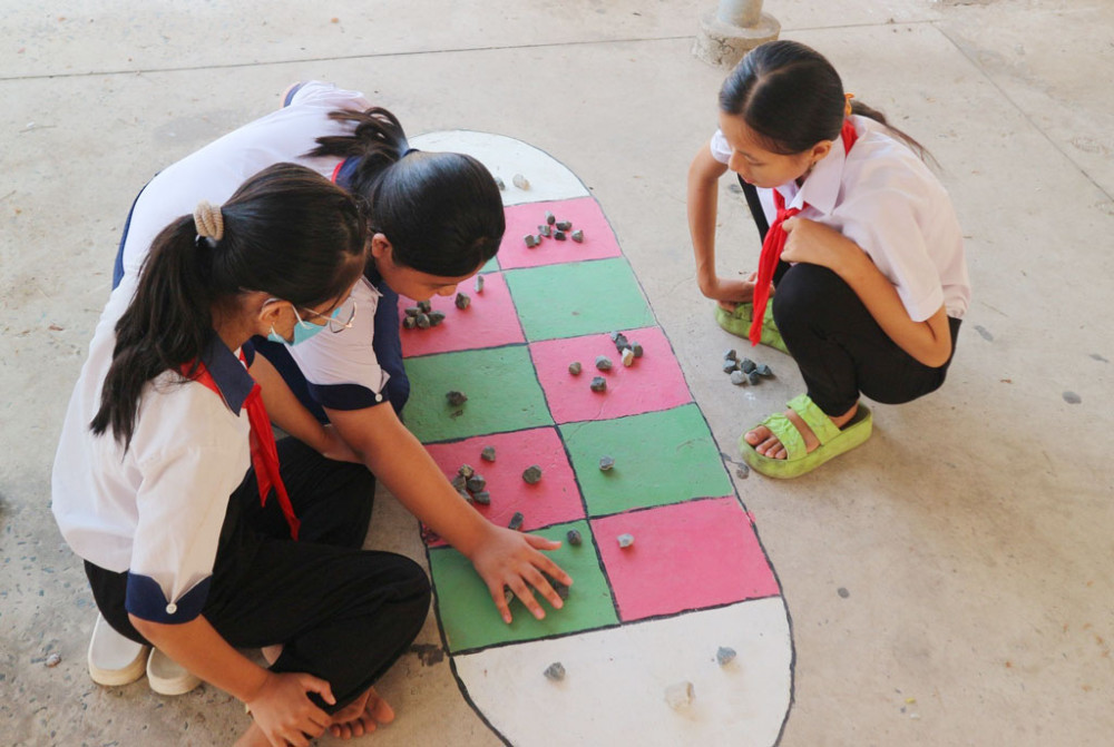 Học sinh Trường Tiểu học Tân Trạch (huyện Cần Đước) vui chơi tại góc các trò chơi dân gian