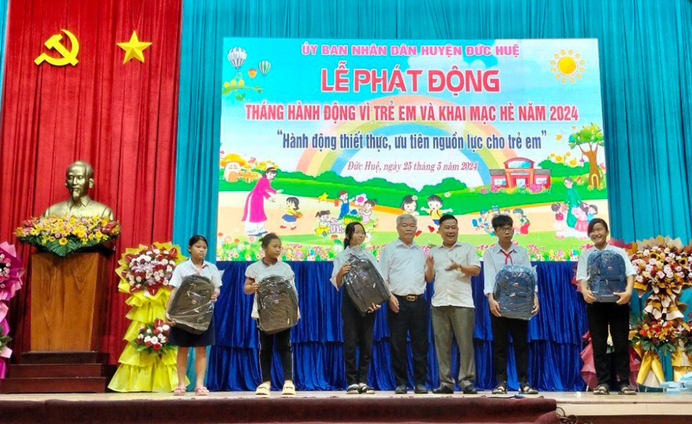 Ngày 25/5 vừa qua, UBND huyện Đức Huệ tổ chức Lễ phát động Tháng hành động Vì trẻ em và Khai mạc hè năm 2024. Dịp này, UBND huyện trao tặng quà cho 100 HS có hoàn cảnh khó khăn, mỗi phần gồm 10 quyển tập và 400.000 đồng tiền mặt.