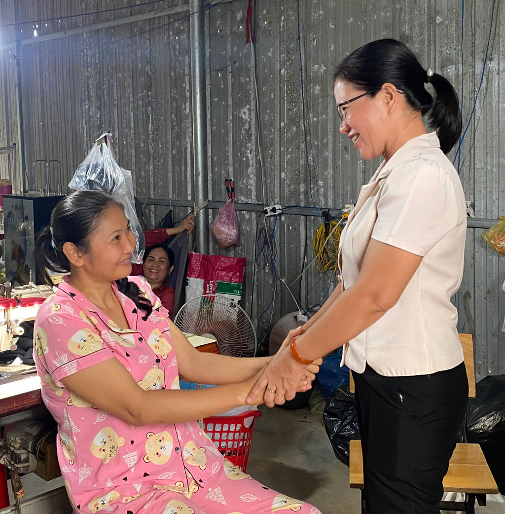 Dù bị khiếm khuyết nhưng chị Nguyễn Thị Kim Liên (bên trái, xã Tân Chánh, huyện Cần Đước) luôn vui vẻ, hạnh phúc