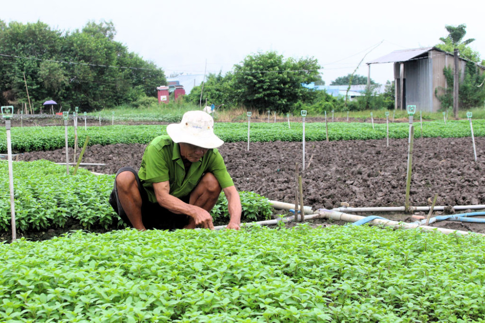 Ông Huỳnh Văn Xài (ấp Trong, xã Phước Hậu, huyện Cần Giuộc) chăm sóc rau húng quế phục vụ thị trường Tết Dương lịch và chuẩn bị cho thị trường Tết Nguyên đán