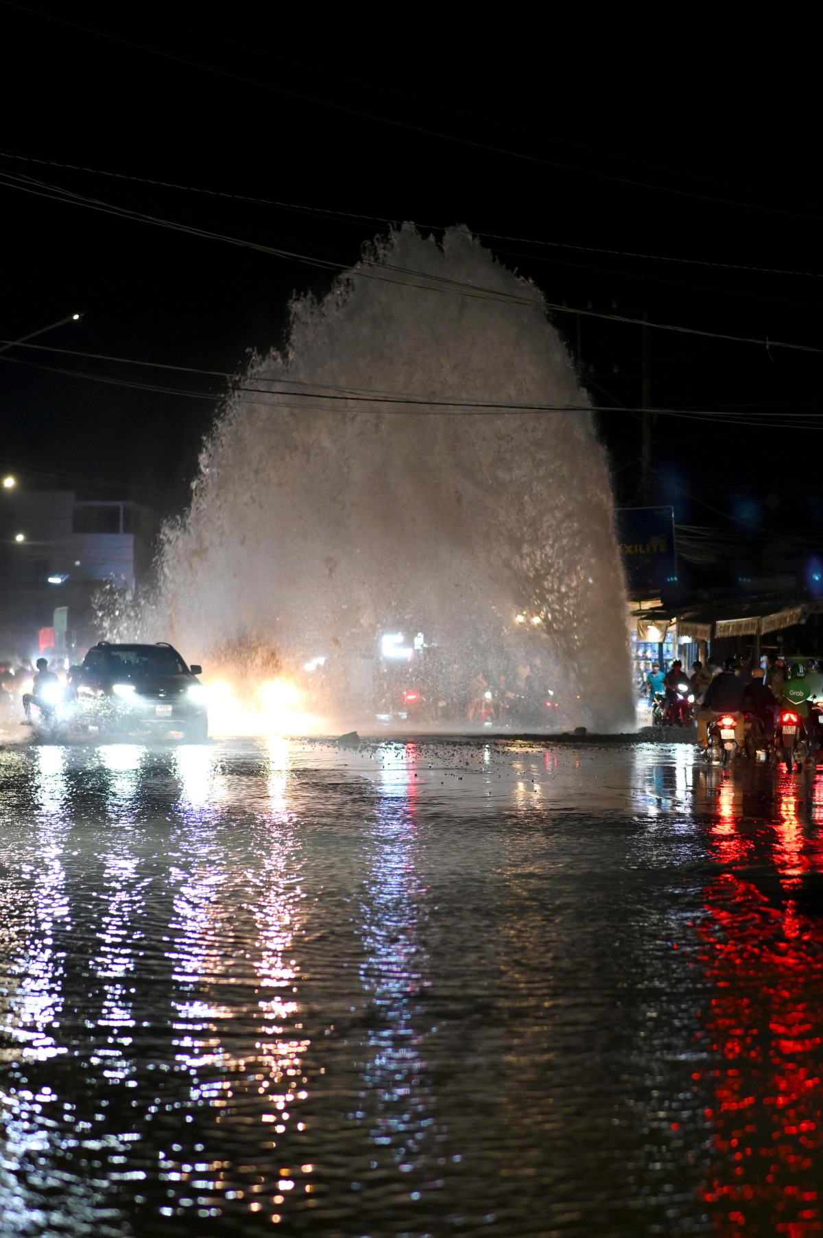 Chiều cao ước tính của vòi nước cỡ bằng tòa nhà 2 tầng khiến việc lưu thông của các phương tiện qua khu vực này gặp nhiều khó khăn (Ảnh: Võ Thành Nguyễn)