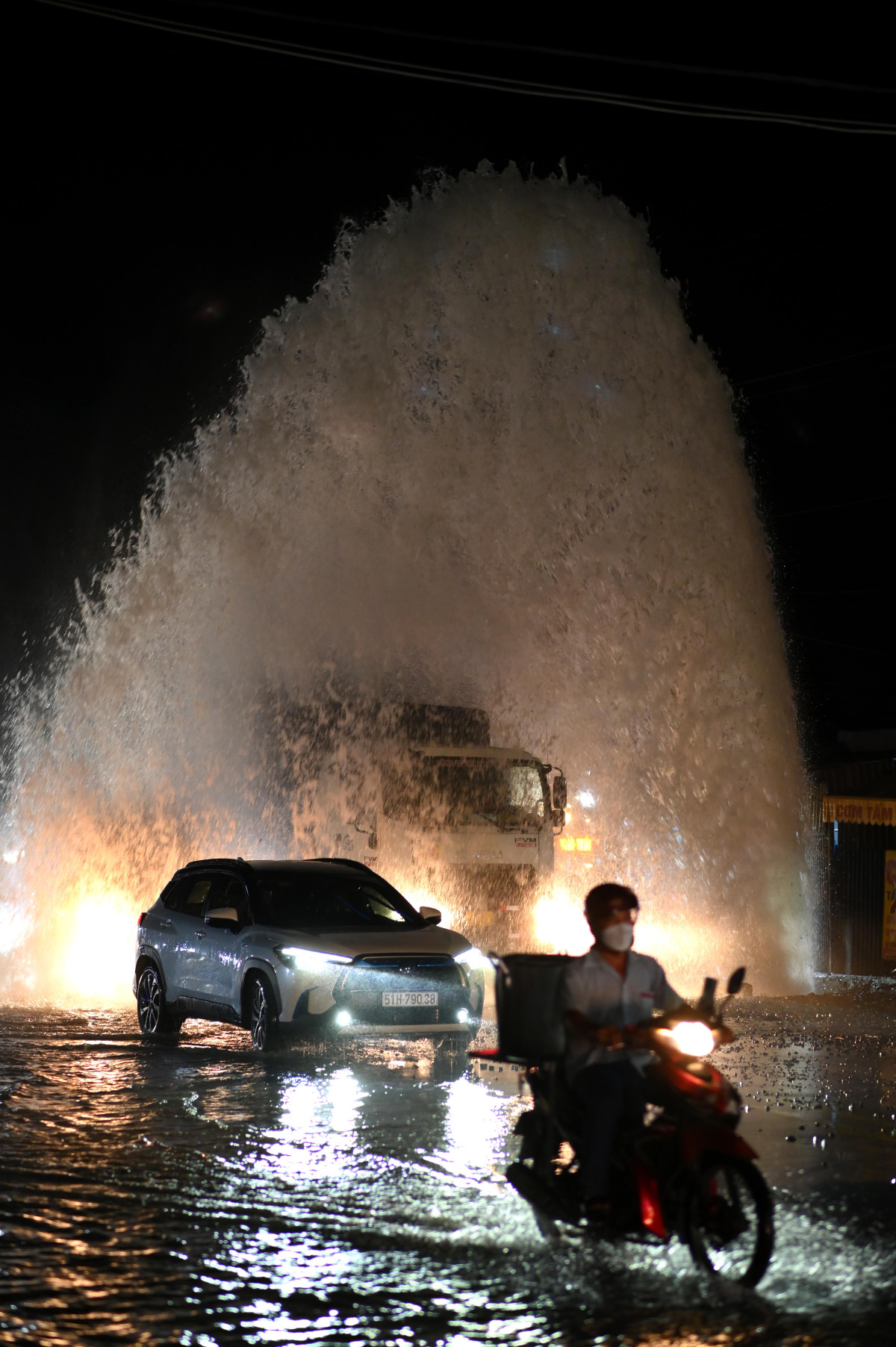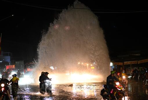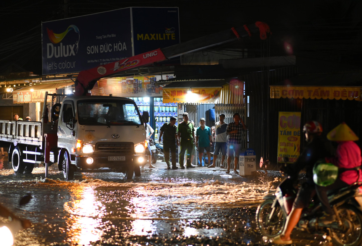 Khoảng 20 giờ, ngày 02/3, trên đường tỉnh 824 đoạn gần ngã 3 Tua 1, thị trấn Đức Hòa, huyện Đức Hòa xảy ra sự cố bể đường ống dẫn nước sinh hoạt (Ảnh: Võ Thành Nguyễn)