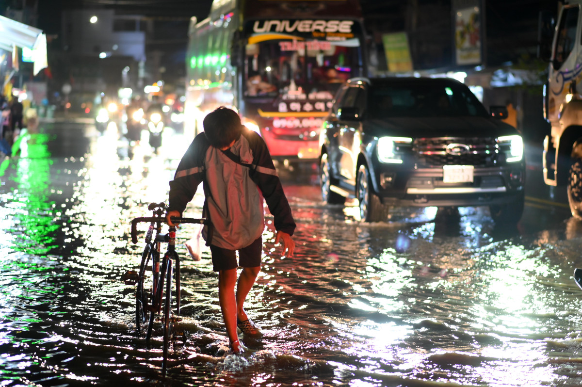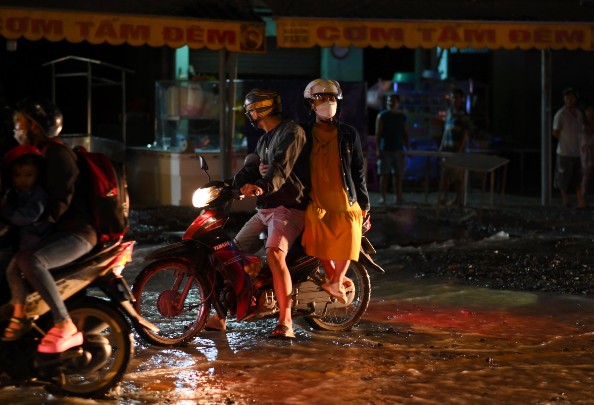 Nước tràn ra ngập đường, người dân phải “vật vã” qua khu vực này (Ảnh: Võ Thành Nguyễn)