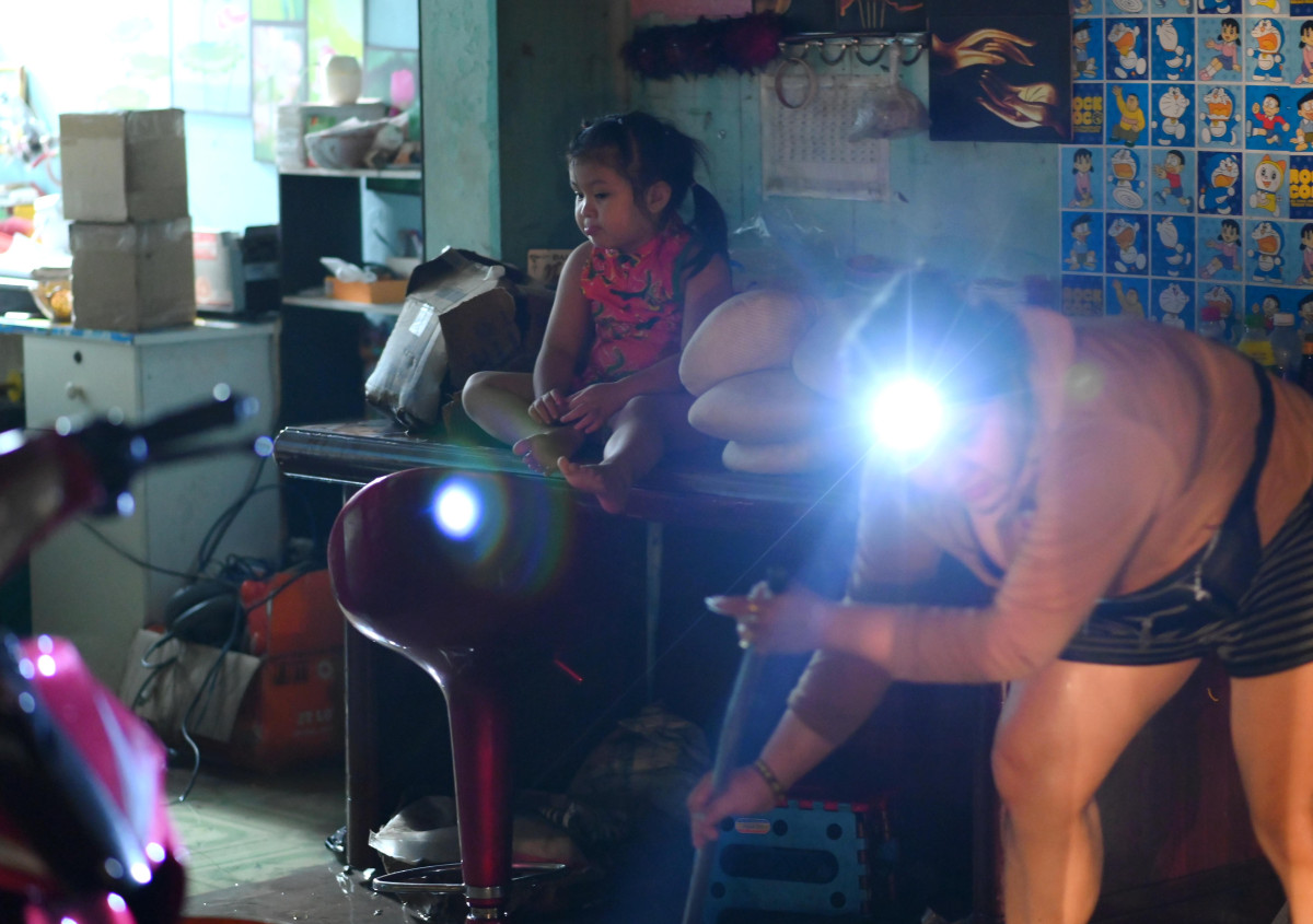 Người dân dùng đèn pin, dụng cụ để tránh nước tràn vào nhà (Ảnh: Võ Thành Nguyễn)