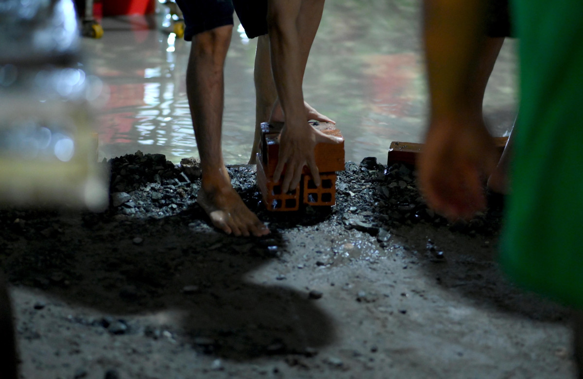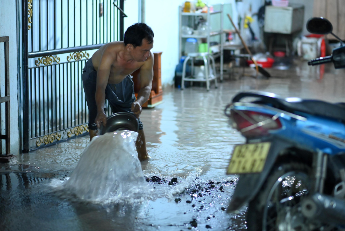 Nhiều người còn dùng cả gạch, đá đắp thành bờ trành nước tiếp tục tràn vào nhà (Ảnh: Võ Thành Nguyễn)