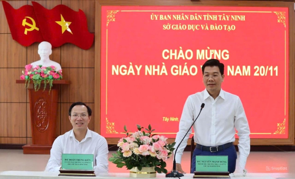 Sáng 19/11, Phó Bí thư Thường trực Tỉnh ủy, Chủ tịch HĐND tỉnh Tây Ninh Nguyễn Mạnh Hùng; Ủy viên Ban Thường vụ Tỉnh ủy, Phó Chủ tịch UBND tỉnh Đoàn Trung Kiên đến thăm, chúc mừng Sở Giáo dục và Đào tạo nhân kỷ niệm 43 năm Ngày Nhà giáo Việt Nam (20/11/1982 - 20/11/2025). Tiếp và làm việc cùng đoàn có Giám đốc Sở Giáo dục và Đào tạo Nguyễn Quang Thái.