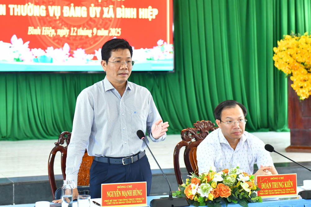 Ngày 12/9, Phó Bí thư Thường trực Tỉnh ủy, Chủ tịch HĐND tỉnh Tây Ninh Nguyễn Mạnh Hùng cùng đoàn công tác đến thăm, làm việc với Ban Thường vụ Đảng ủy xã Bình Hiệp về tình hình hoạt động sau khi vận hành bộ máy chính quyền địa phương 2 cấp. Tham dự đoàn công tác có Ủy viên Ban Thường vụ Tỉnh ủy, Phó Chủ tịch UBND tỉnh Đoàn Trung Kiên.
