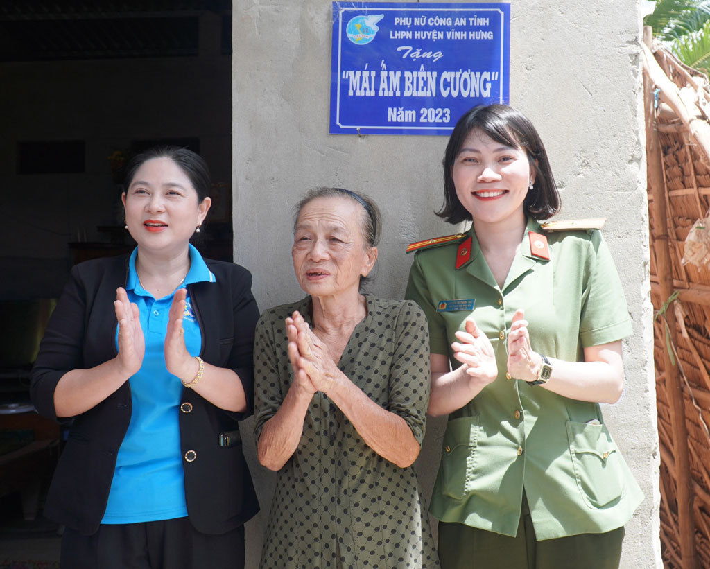 Thiếu tá Nguyễn Thị Thanh Thúy - Trưởng ban Phụ nữ Công an tỉnh, trao Mái ấm biên cương tại huyện Vĩnh Hưng