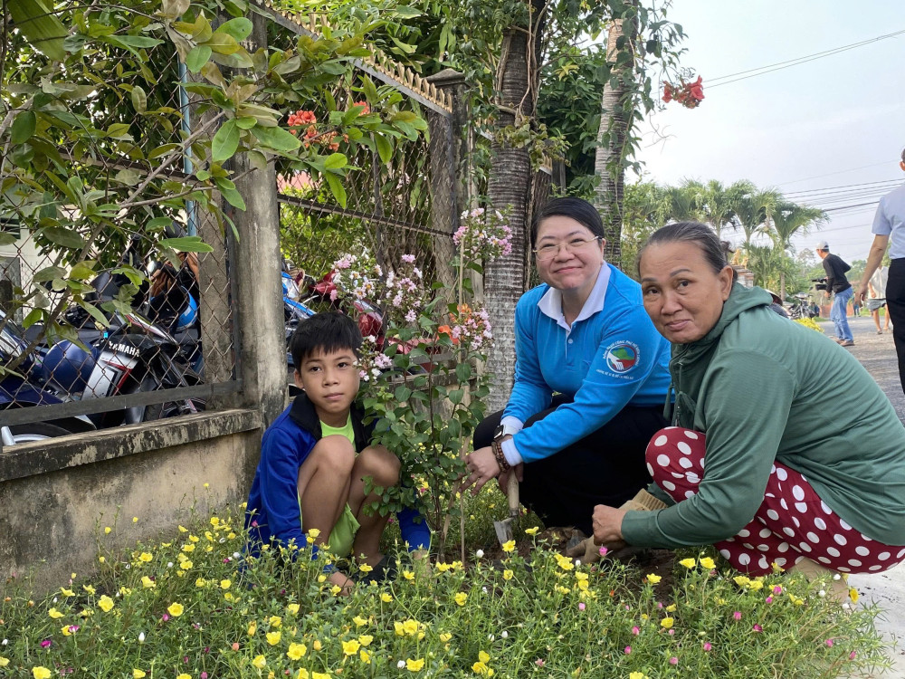 Bà Phan Thị Thùy Vân - Phó Chủ tịch UBMTTQ Việt Nam tỉnh, Chủ tịch Hội Liên hiệp Phụ nữ tỉnh cùng người dân trồng hoa làm đẹp tuyến đường