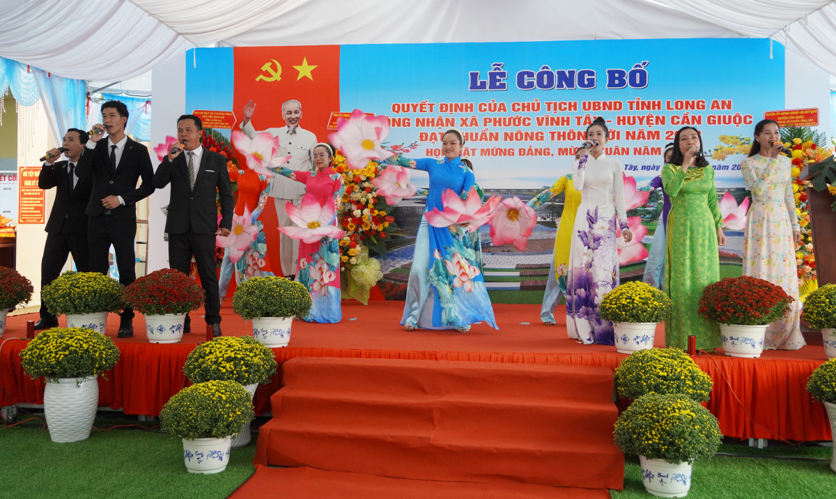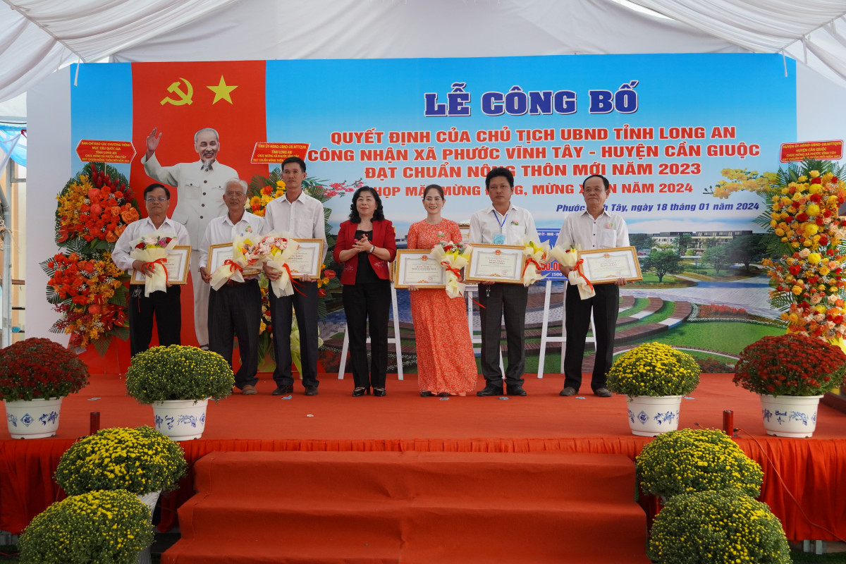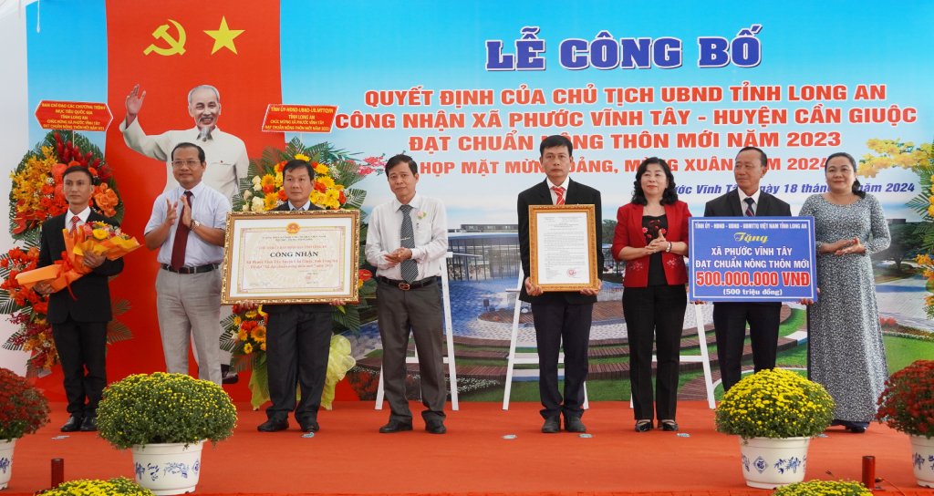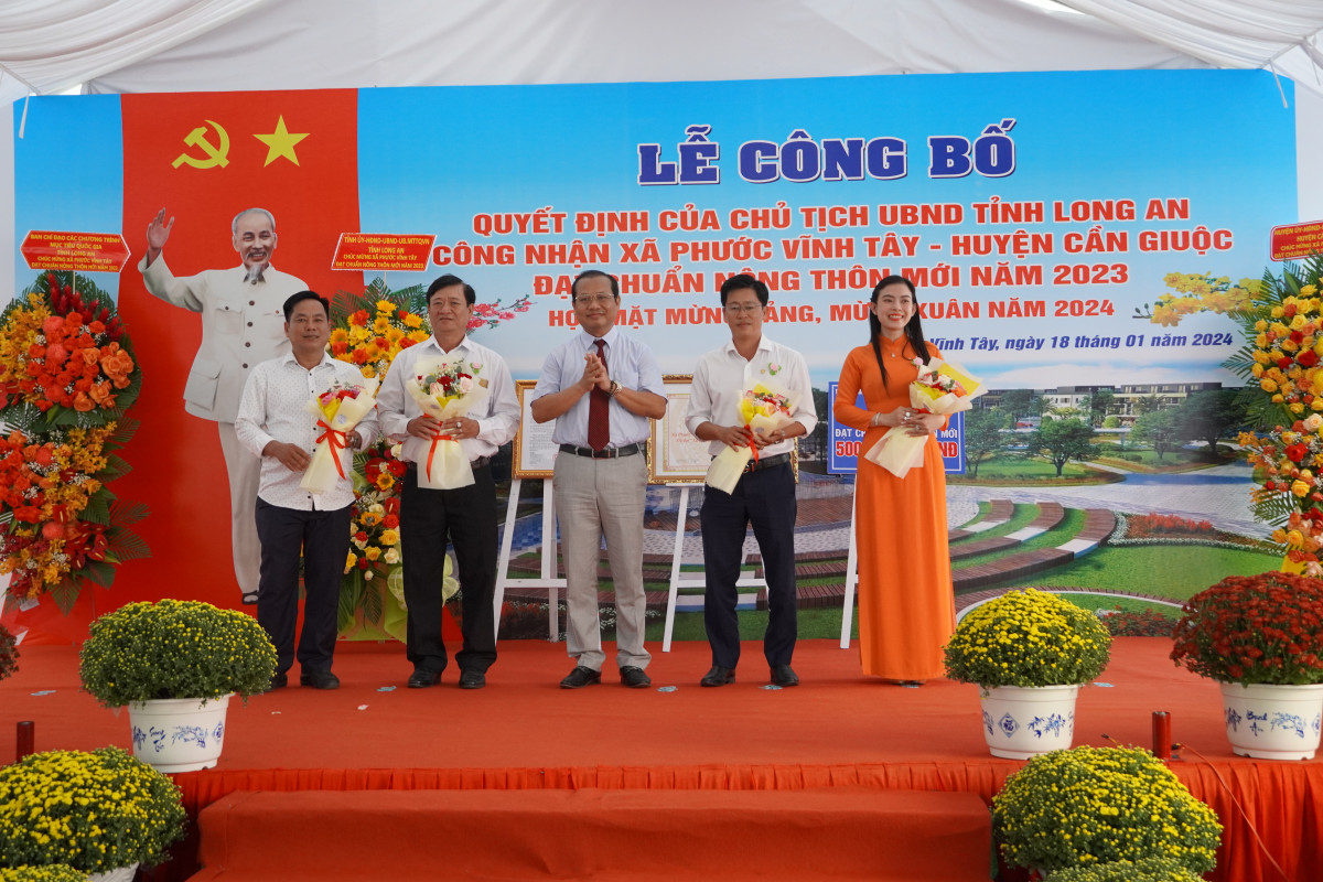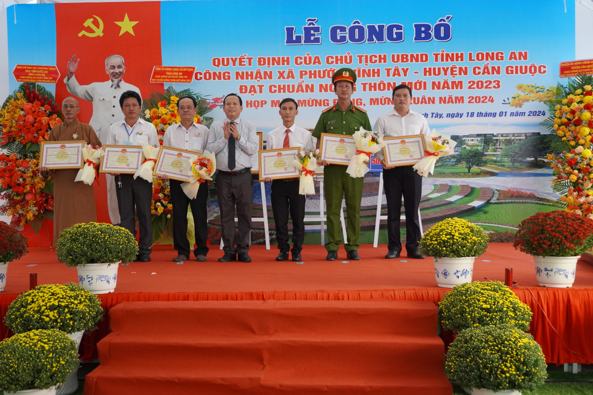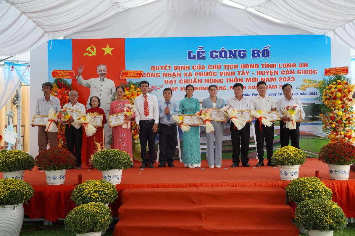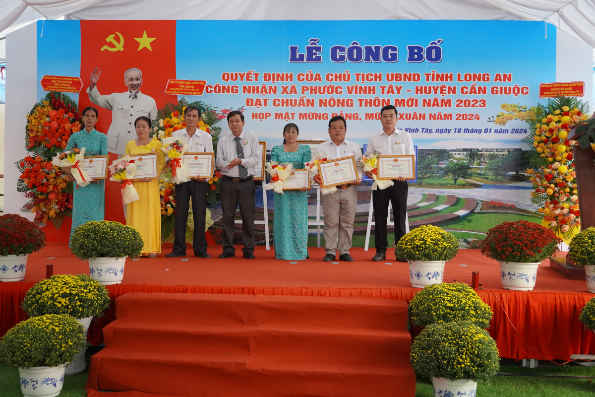 Chiều 18/01, huyện Cần Giuộc tổ chức Lễ công bố quyết định của Chủ tịch UBND tỉnh công nhận xã Phước Vĩnh Tây đạt chuẩn nông thôn mới năm 2023 và họp mặt mừng Đảng, mừng Xuân năm 2024. Đến dự có lãnh đạo Sở Lao động - Thương binh và Xã hội; lãnh đạo Sở Nông nghiệp và Phát triển nông thôn; Bí thư Huyện ủy Cần Giuộc - Trương Thanh Liêm; các đồng chí lãnh đạo huyện qua các thời kỳ.