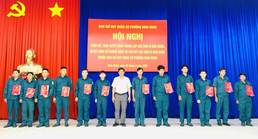 Sáng 09/9, Ban Chỉ huy Quân sự (CHQS) phường Bình Minh, tỉnh Tây Ninh tổ chức Hội nghị công bố và trao quyết định thành lập đơn vị Dân quân tự vệ, bổ nhiệm chức vụ cán bộ chỉ huy đơn vị Dân quân năm 2025.