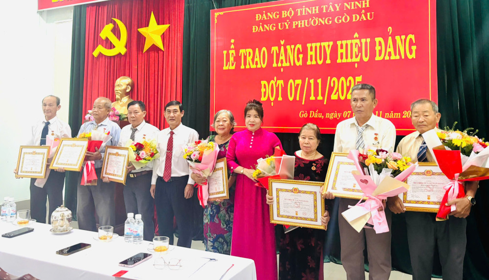 Sáng 07/11, Đảng uỷ phường Gò Dầu (tỉnh Tây Ninh) tổ chức lễ trao tặng Huy hiệu Đảng đợt 07/11 cho 21 đảng viên đang sinh hoạt tại các chi bộ trực thuộc Đảng bộ phường.