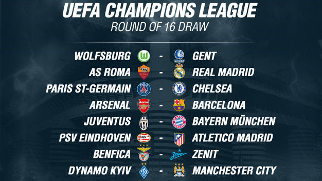 Các cặp đấu vòng 16 đội Champions League. Ảnh: Goal.com
