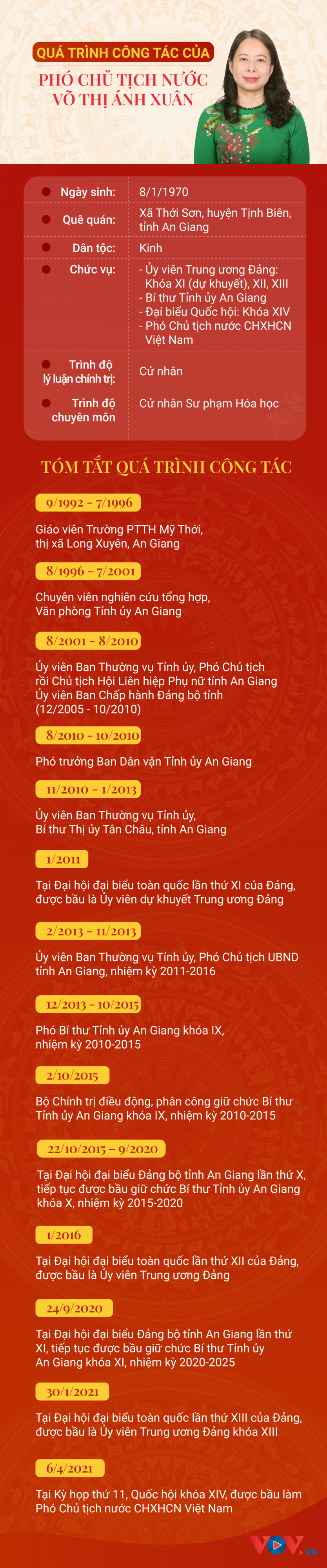 Bà Võ Thị Ánh Xuân sinh năm 1970 tại An Giang. Trước khi được bầu làm Phó Chủ tịch nước, bà Võ Thị Ánh Xuân giữ chức Bí thư Tỉnh ủy An Giang từ năm 2015.