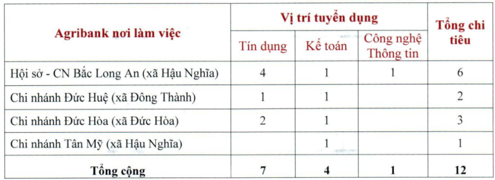 Ngân hàng Nông nghiệp và Phát triển Nông thôn Việt Nam (Agribank) - Chi nhánh Bắc Long An tuyển dụng lao động đợt 1 năm 2025 với 12 chỉ tiêu, làm việc tại các vị trí sau: