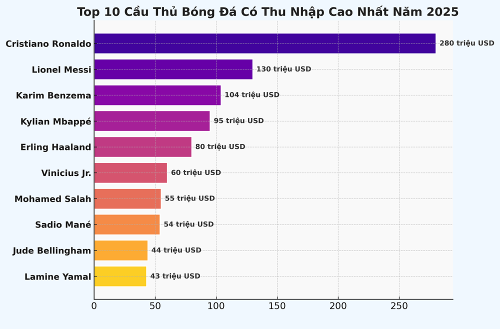 Ngôi sao bóng đá Bồ Đào Nha Cristiano Ronaldo một lần nữa đứng đầu danh sách cầu thủ có thu nhập cao nhất thế giới của Forbes ở mùa giải 2025-2026. Ước tính Ronaldo thu nhập 280 triệu USD, gấp đôi so với kình địch Lionel Messi.