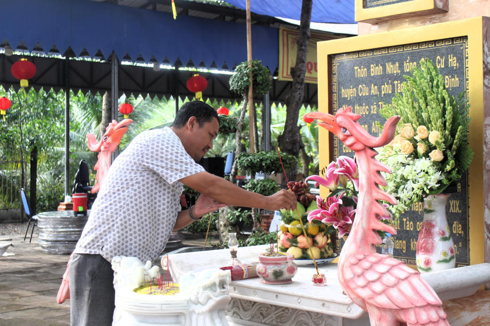 Bàn thờ cụ Nguyễn Trung Trực được bày trí trang trọng trước một điểm phục vụ bữa ăn miễn phí tại Xóm Nghề