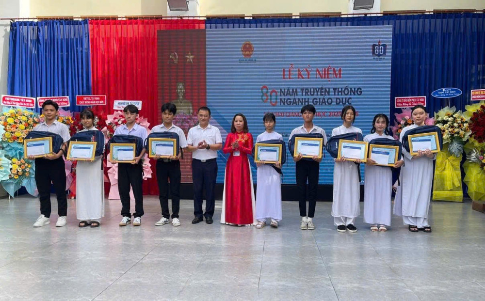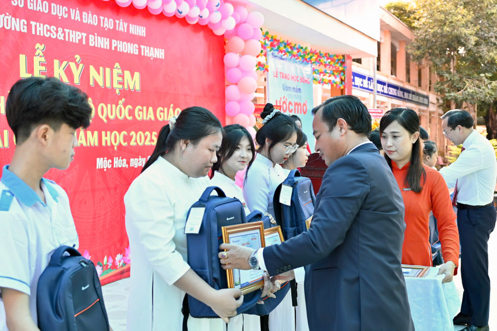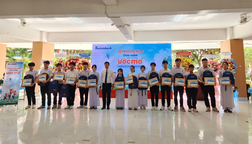 Nhân dịp khai giảng năm học 2025 - 2026, Sacombank tiếp tục triển khai chương trình học bổng “Ươm mầm cho những ước mơ” trên toàn quốc. Riêng tại tỉnh Tây Ninh, Sacombank trao tặng 195 suất học bổng, mỗi suất trị giá 1,5 triệu đồng kèm ba lô đến học sinh của 17 trường học trên địa bàn. Trong đó, có 2 em được nhận giải thưởng từ cuộc thi vẽ “Sắc màu Sacombank”.