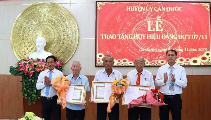 Ông Phạm Mi (thứ 2, từ phải qua) nhận Huy hiệu 60 năm tuổi Đảng