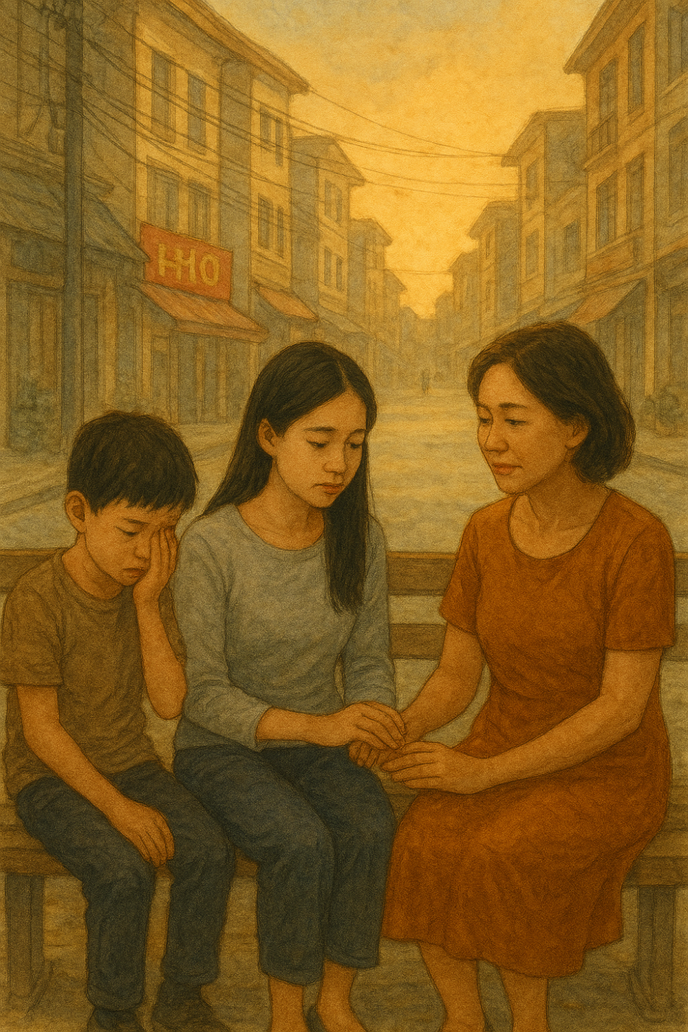 Hùng khẽ khóc nấc. Xa xa, những hạt nắng cuối cùng trượt khỏi mái ngói, tan dần như hơi thở sau cùng của một ngày. Yến cúi đầu, hai bàn tay nắm chặt vào nhau: