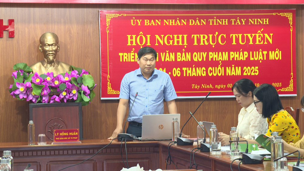 Sáng 02/10, Sở Tư pháp - Cơ quan Thường trực Hội đồng phối hợp phổ biến, giáo dục pháp luật (PBGDPL) tỉnh tổ chức Hội nghị trực tuyến triển khai các văn bản pháp luật mới đợt 1 trong 6 tháng cuối năm 2025. Phó Giám đốc Sở Tư pháp Lý Hồng Huấn - Phó Chủ tịch Hội đồng PBGDPL chủ trì. Hội nghị được kết nối trực tuyến tới điểm cầu các xã, phường trên địa bàn tỉnh.