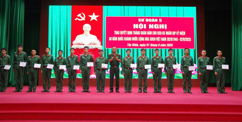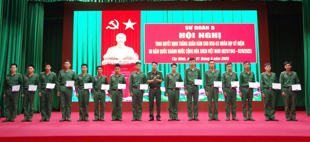 Chiều 01/9, Sư đoàn 5 tổ chức trao quyết định thăng quân hàm cho hạ sĩ quan - binh sĩ (HSQ-BS) khối cơ quan, đơn vị trực thuộc Sư đoàn nhân dịp kỷ niệm 80 năm Cách mạng Tháng Tám thành công (19/8/1945 - 19/8/2025) và Quốc khánh nước Cộng hòa xã hội chủ nghĩa Việt Nam (02/9/1945 - 02/9/2025). Đại tá Cao Văn Thắng - Phó Sư đoàn trưởng, Tham mưu trưởng Sư đoàn chủ trì buổi lễ.