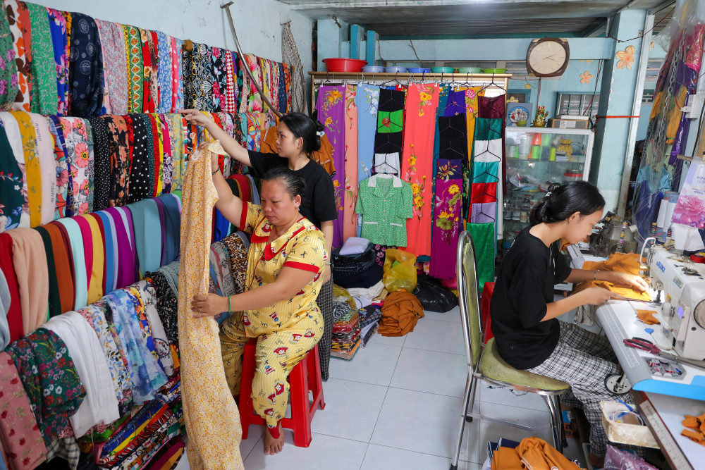 Chị Bích cùng 2 con gái may đồ cho khách (Ảnh: Duy Hiển)