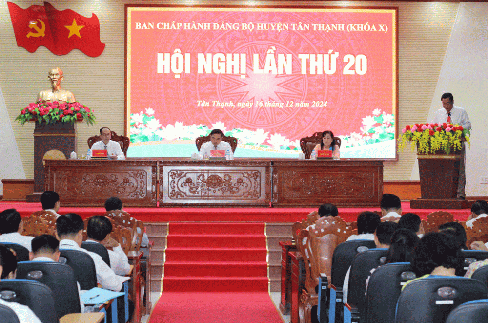 Chiều 16/12, Ban Chấp hành Đảng bộ huyện Tân Thạnh khóa X, nhiệm kỳ 2020 - 2025 tổ chức Hội nghị lần thứ 20 để đánh giá tình hình thực hiện Nghị quyết Huyện ủy năm 2024 và đề ra phương hướng, nhiệm vụ năm 2025. Đến dự hội nghị có Ủy viên Ban Thường vụ Tỉnh ủy, Phó Chủ tịch Thường trực HĐND tỉnh Long An - Mai Văn Nhiều; đại diện các Ban Xây dựng Đảng Tỉnh ủy. Bí thư Huyện ủy - Bùi Quốc Bảo chủ trì hội nghị.