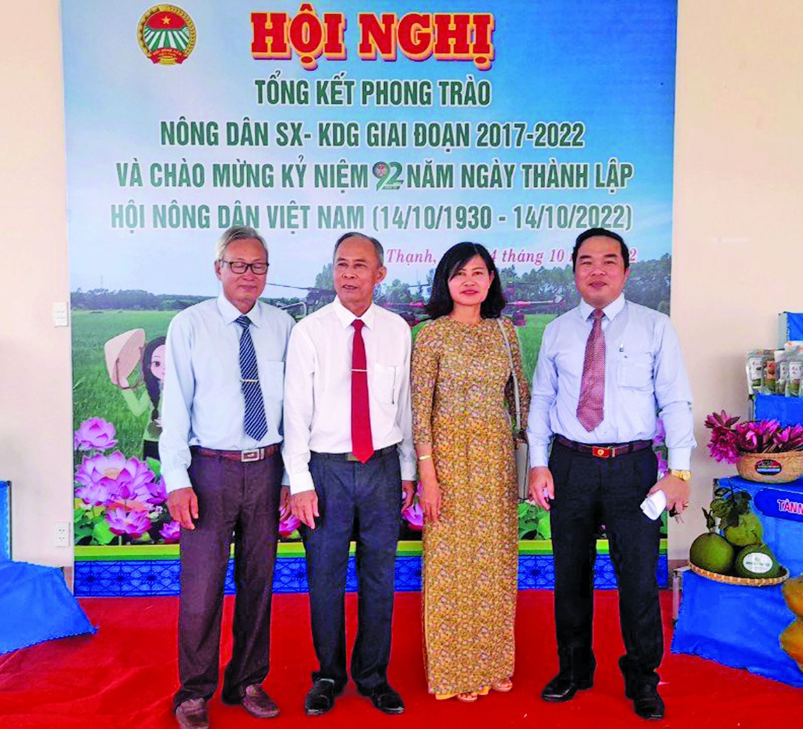 Bí thư Huyện ủy Tân Thạnh - Bùi Quốc Bảo (bìa phải), dự tổng kết phong trào Nông dân sản xuất - kinh doanh giỏi, động viên nông dân nâng tầm sản phẩm địa phương ( Ảnh: Chí Tâm)