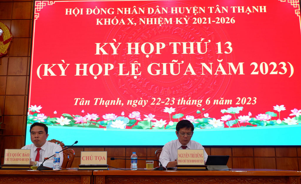 Ngày 22/6, HĐND huyện Tân Thạnh khóa X, nhiệm kỳ 2021-2026 tổ chức khai mạc Kỳ họp thứ 13 (Kỳ họp lệ giữa năm 2023) nhằm đánh giá kết quả thực hiện Nghị quyết HĐND huyện 6 tháng đầu năm 2023 và thảo luận thông qua một số vấn đề quan trọng của huyện. Bí thư Huyện ủy, Chủ tịch HĐND huyện - Bùi Quốc Bảo chủ trì hội nghị.