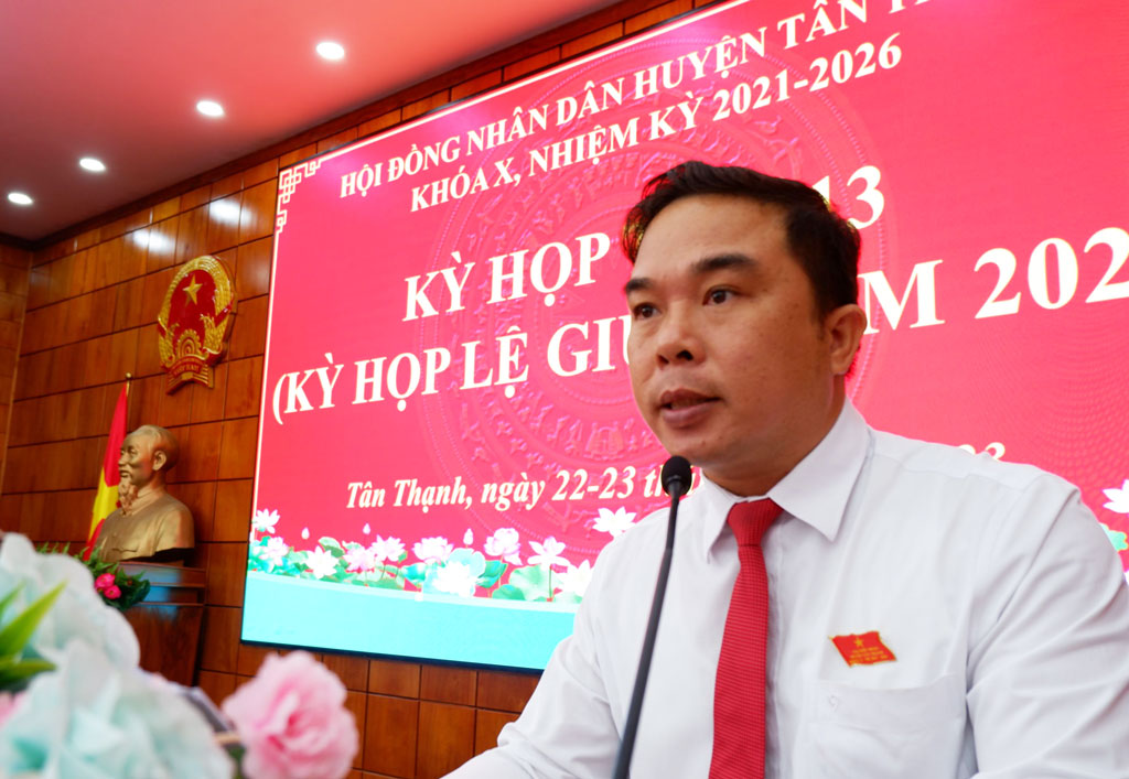 .jpg) Bí thư Huyện ủy, Chủ tịch HĐND huyện Tân Thạnh - Bùi Quốc Bảo (bên trái) chủ trì kỳ họp