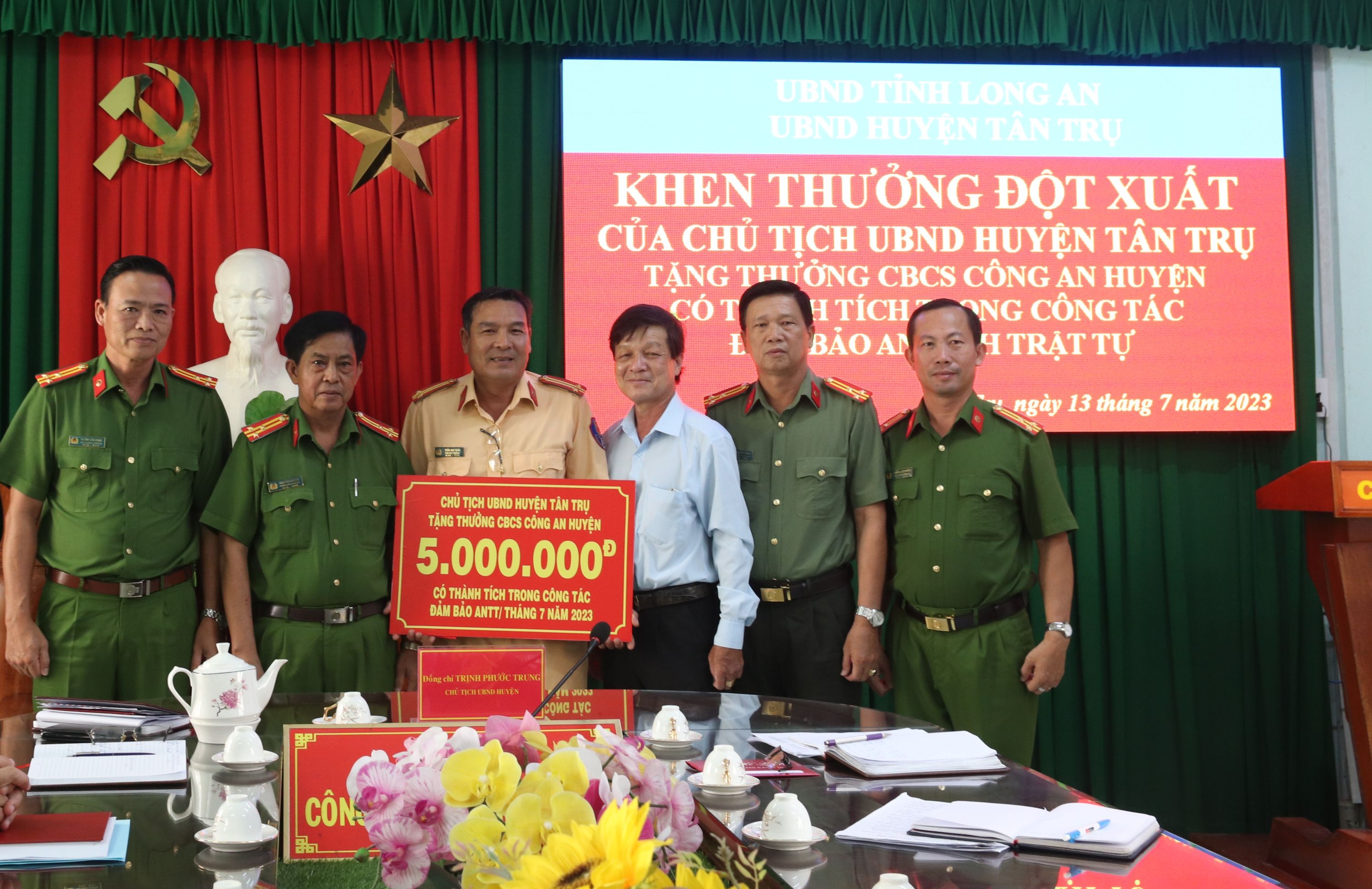 Chủ tịch UBND huyện Tân Trụ, tỉnh Long An - Trịnh Phước Trung vừa gặp gỡ và tặng thưởng đột xuất cho cán bộ, chiến sĩ Công an huyện vì có thành tích trong công tác bảo đảm an ninh, trật tự (ANTT) trên địa bàn.