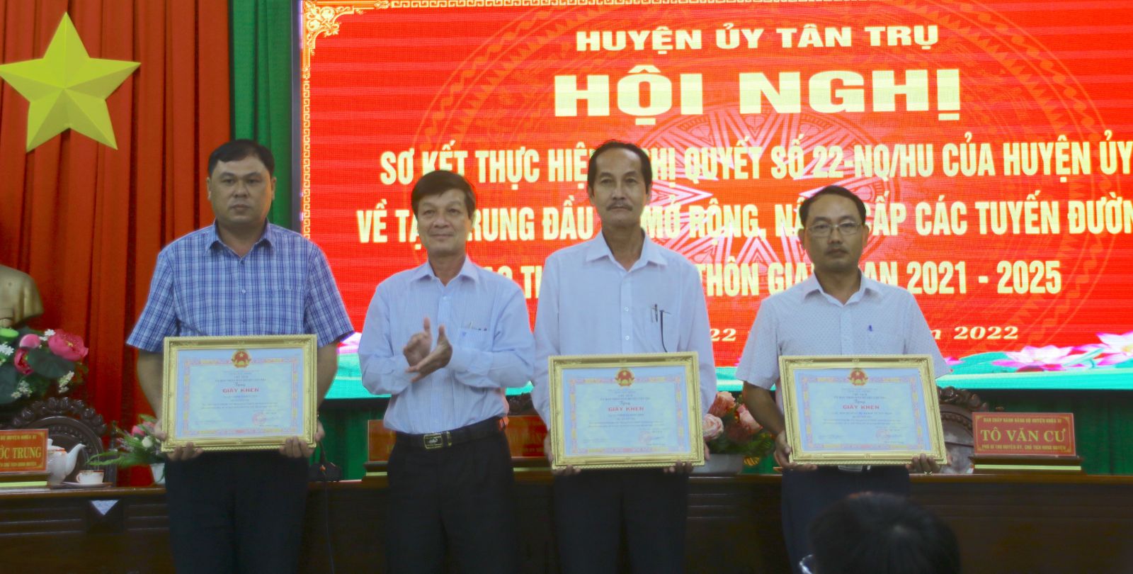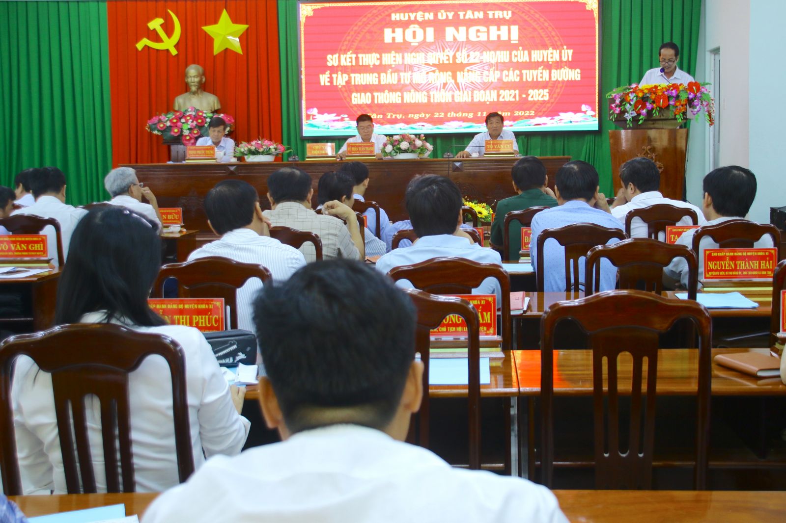 Chiều 22/11, Huyện ủy Tân Trụ, tỉnh Long An tổ chức Hội nghị sơ kết tình hình thực hiện Nghị quyết số 22-NQ/HU, ngày 24/9/2021 của Huyện ủy về tập trung đầu tư mở rộng, nâng cấp các tuyến đường giao thông nông thôn giai đoạn 2021-2025. Bí thư Huyện ủy Tân Trụ – Võ Trần Tuấn Thanh; Phó Bí thư Huyện ủy, Chủ tịch HĐND huyện Tân Trụ - Tô Văn Cư; Quyền Chủ tịch UBND huyện Tân Trụ – Trịnh Phước Trung chủ trì hội nghị.