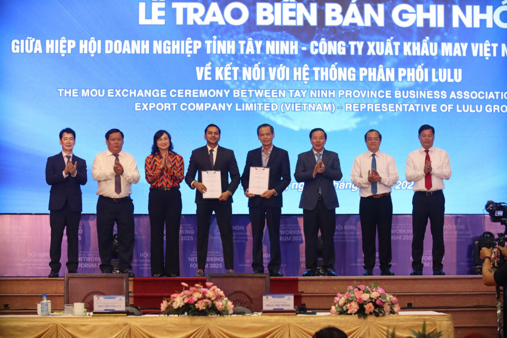 Phó Bí thư Tỉnh ủy, Chủ tịch UBND tỉnh Tây Ninh Nguyễn Văn Út chứng kiến lễ trao biên bản ghi nhớ giữa các doanh nghiệp tại Hội nghị kết nối chuỗi cung ứng hàng hóa xuất nhập khẩu và thương mại điện tử năm 2025
