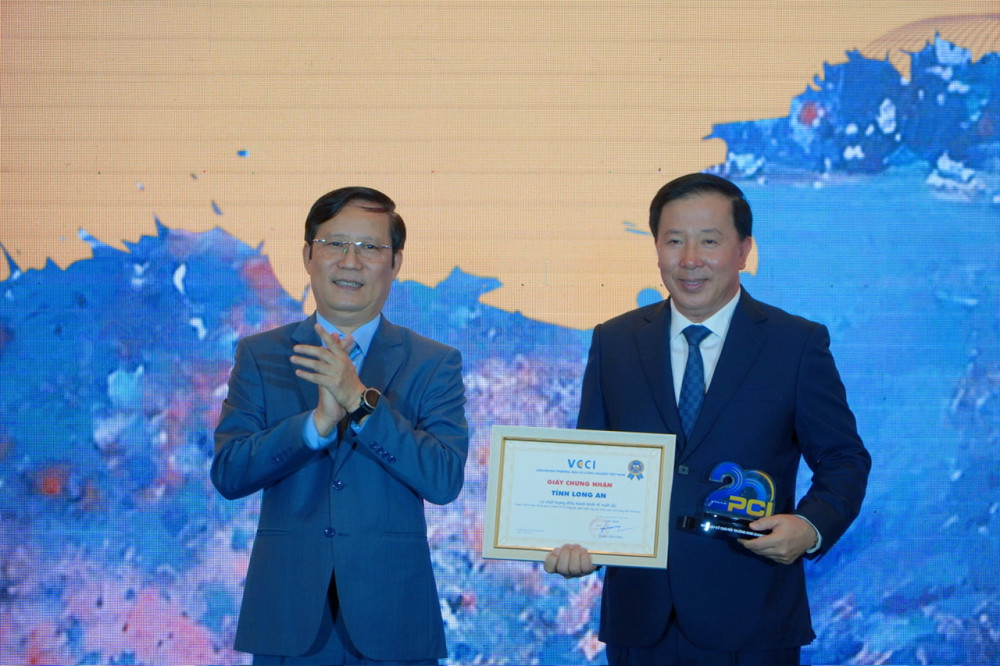 Chủ tịch VCCI Phạm Tấn Công trao giấy chứng nhận cho tỉnh Long An (cũ) với vị trí thứ 2/63 tỉnh, thành phố cải cách nhất trong hai thập kỷ qua