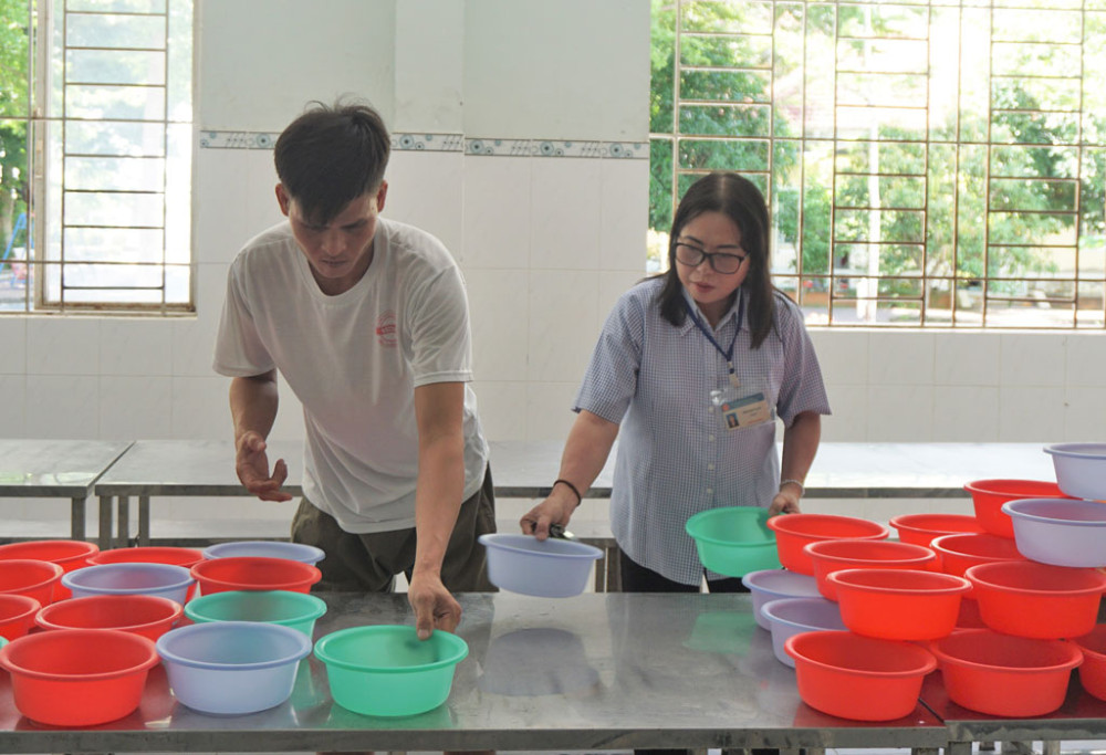 Chị Trần Thị Mỹ Hạnh (phường 3, TP.Tân An) hướng dẫn một bệnh nhân tâm thần nhẹ sắp xếp vật dụng chuẩn bị ăn trưa