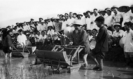 Chủ tịch Hồ Chí Minh sử dụng thủ chiếc máy cấy tại ruộng thí nghiệm của Sở Nông Lâm, Hà Nội tháng 7/1960. (Ảnh: Tư liệu TTXVN)