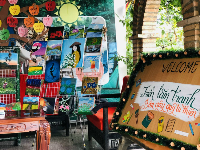 Một góc triển lãm tranh gây quỹ từ thiện của các cô và học sinh Nhóm trẻ Ngôi Nhà Nhỏ
