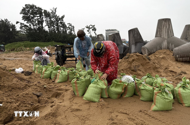 Người dân phường Tuy Hòa khẩn trương làm bao cát chèn chống nhà cửa. (Ảnh: Tường Quân/TTXVN)