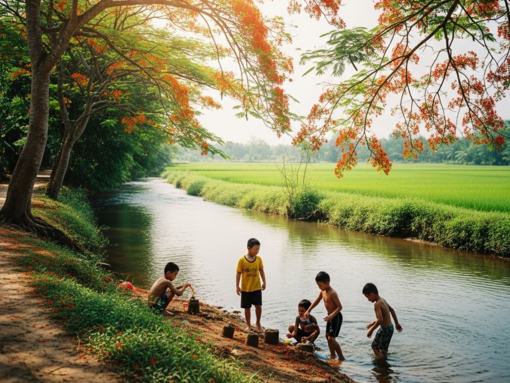 Những đứa trẻ nhà quê lại vùng vẫy sông xanh trong tiếng nói cười rôm rả. Tôi đứng trên bờ nhìn đám trẻ mà miệng cười lúc nào không hay. Tự nhiên tôi thấy nhớ tuổi thơ của mình đến lạ. Cũng những buổi trưa hè trốn mẹ tắm sông, bày đủ thứ trò “trời ơi đất hỡi”. Trẻ con quê tôi thường bơi rất giỏi, phần vì ở xứ toàn là sông, rạch chằng chịt, phần vì phải theo người lớn ra đồng, ra sông từ nhỏ nên đứa nào đứa nấy cũng học bơi cho bằng được. Khúc sông trước nhà thành kỷ niệm bên lòng không thể mờ phai. Chúng tôi thường bơi thi với đám trẻ bên kia sông, thành ra đôi bờ sông cứ như xích gần lại với nhau. Rồi những “trận chiến” móc sình chọi nhau đến nỗi mặt mày tái mét, mắt đỏ ngầu, khản cả giọng đến chập tối mới chịu leo lên bờ trở về nhà.