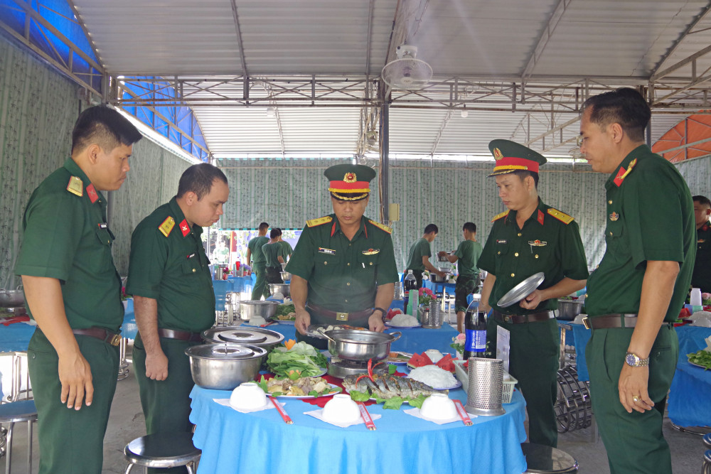Thượng tá Trần Đức Thế (đứng giữa) kiểm tra bảo đảm bữa ăn cho bộ đội