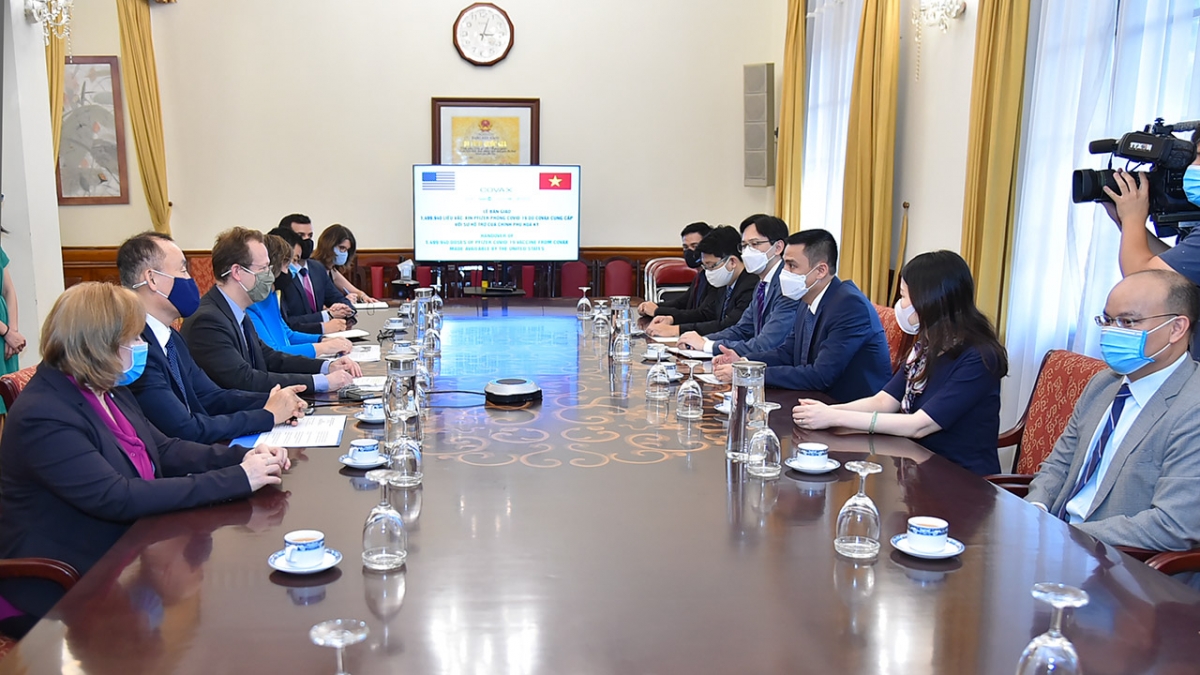 Chiều 4/10/2021, Bộ Ngoại giao tổ chức tiếp nhận tượng trưng 1,5 triệu liều vaccine Pfizer/BionTech phòng COVID-19 do Chương trình COVAX cung cấp với sự hỗ trợ của Chính phủ Hoa Kỳ.