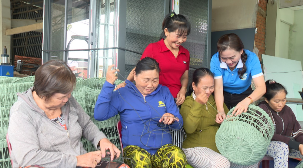 Hội viên phụ nữ học nghề đan sản phẩm nhựa giả mây