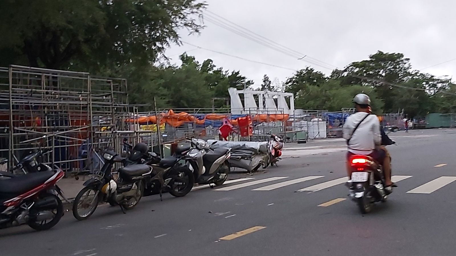 Tuyến đường Nguyễn An Ninh dài cả cây số trở nên vắng lặng, trống trải. Ô dù, khung sạp được xếp lại để ở bên góc đường.