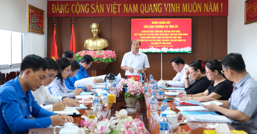 Chiều 30/10, Đoàn giám sát của Ban Thường vụ Tỉnh ủy do Ủy viên Ban Thường vụ Tỉnh ủy, Trưởng ban Tuyên giáo Tỉnh ủy – Hoàng Đình Cán làm Trưởng đoàn đến giám sát việc lãnh, chỉ đạo thực hiện Kết luận số 21-KL/TW, ngày 25/10/2021 của Ban Chấp hành Trung ương Đảng khóa XIII gắn với thực hiện Kết luận số 01-KL/TW, ngày 18/5/2021 của Bộ Chính trị tại Đảng ủy Tỉnh Đoàn Long An.
