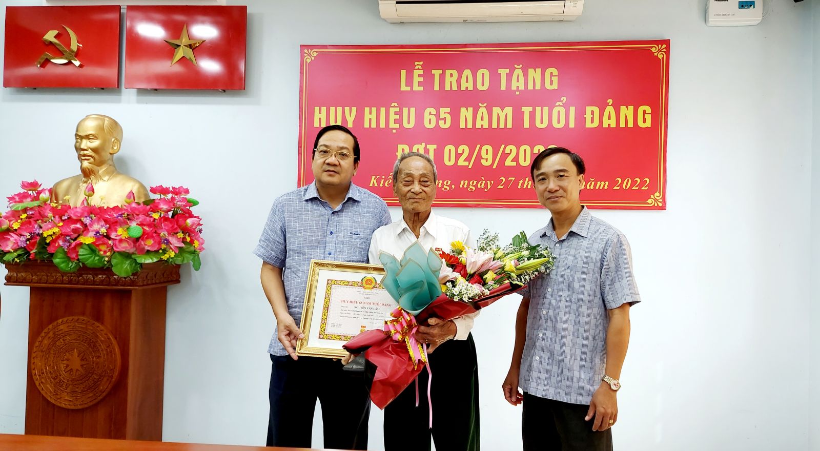 Ủy viên Ban Thường vụ Tỉnh ủy, Phó Chủ tịch UBND tỉnh - Nguyễn Minh Lâm (bên trái) và Phó Bí thư Thường trực Thị ủy Kiến Tường - Lê Hồng Hạnh tặng hoa và trao Huy hiệu 65 năm tuổi Đảng cho đảng viên Nguyễn Văn Lắm