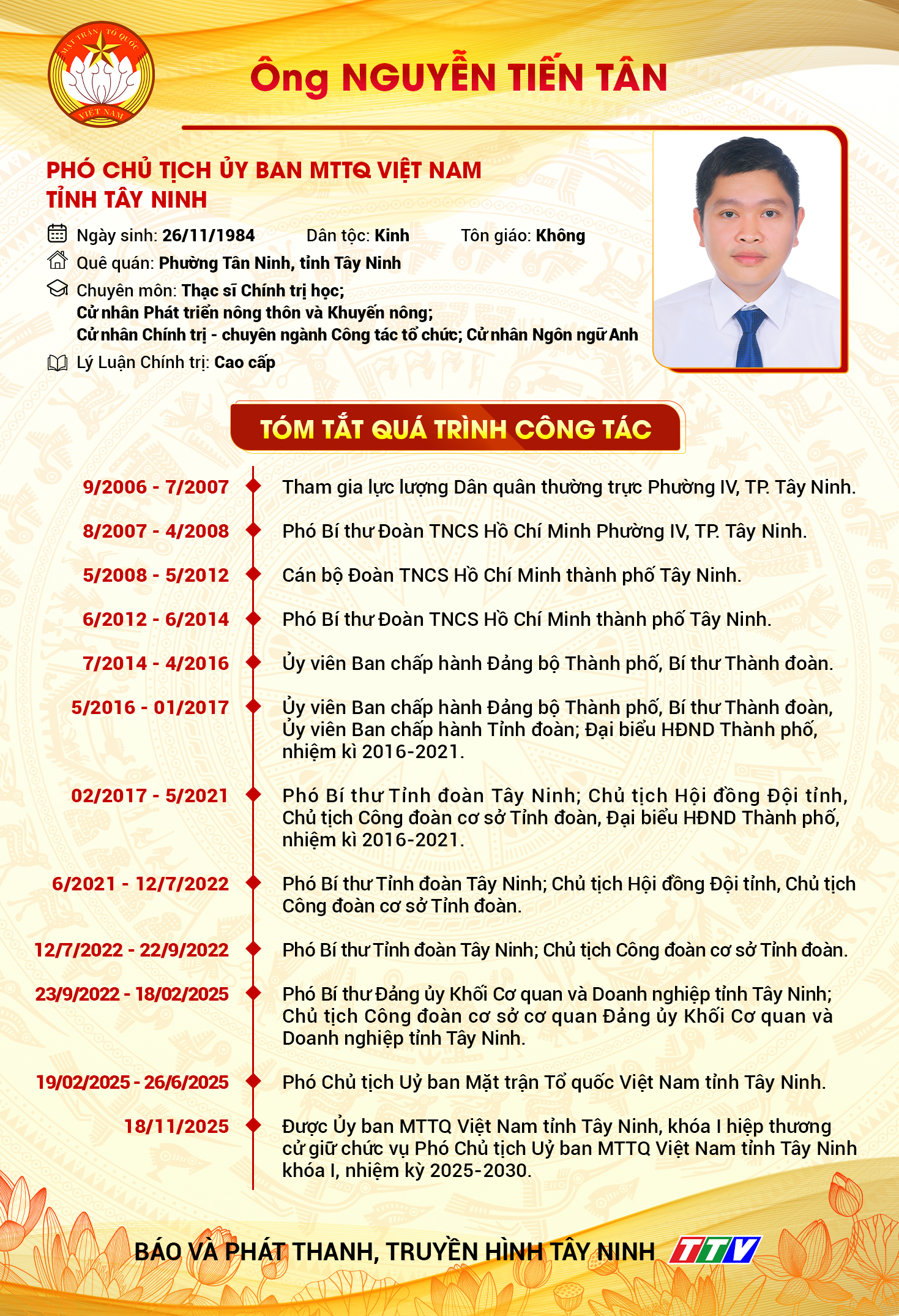 Tại phiên làm việc thứ nhất Đại hội đại biểu MTTQ Việt Nam tỉnh Tây Ninh khóa I, nhiệm kỳ 2025 - 2030, diễn ra ngày 17/11/2025, các đại biểu hiệp thương dân chủ cử ông Nguyễn Tiến Tân giữ chức Phó Chủ tịch UBMTTQ Việt Nam tỉnh Tây Ninh khóa I, nhiệm kỳ 2025 - 2030.